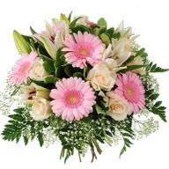 Когда в одном букете смешиваются герберы, лилии и розы – приятный, запоминающийся запах гарантирован. Нежные цвета придают букету стиль и изысканность, а украшение папоротником вносит дополнительный штрих в общую картину. Букет означает искренность, светлость и улыбку, подходит для друзей или коллег, чтобы извиниться или просто порадовать.