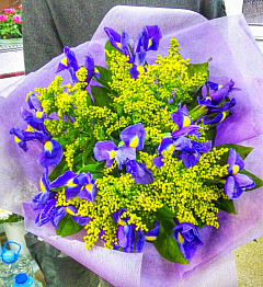 Необычное сочетание цветов в этом букете делает его очень оригинальным и уникальным. Насыщенно-фиолетовые ирисы, олицетворяющие на языке цветов отвагу и мужество, в сочетании с ярко-желтыми солидаго, создают невероятную контрастную композицию, а дополнительное украшение из зелени салала делает ее еще более насыщенной. Этот поистине джентельментский букет станет универсальным подарком на любой праздник или просто в обыденный день, а также поможет получателю забыть все обиды.