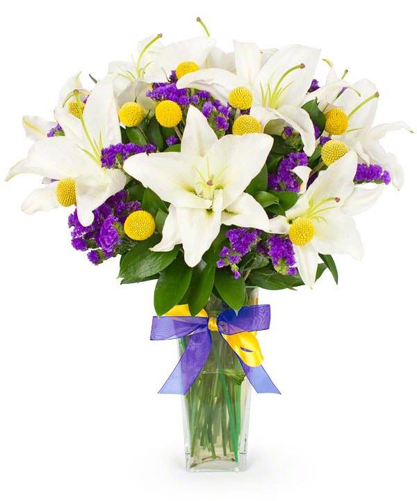 Букет «Пыльца» - удачное сочетание нежного белого цвета, успокаивающего фиолетового и яркого желтого. Лилии, из которых состоит композиция, означают невинность, отсутствие корысти и чистоту. Принести извинения с такими цветами проще и приятнее, оценят жест не только члены семьи, но и друзья, удивленные изысканностью и нежностью букета.
